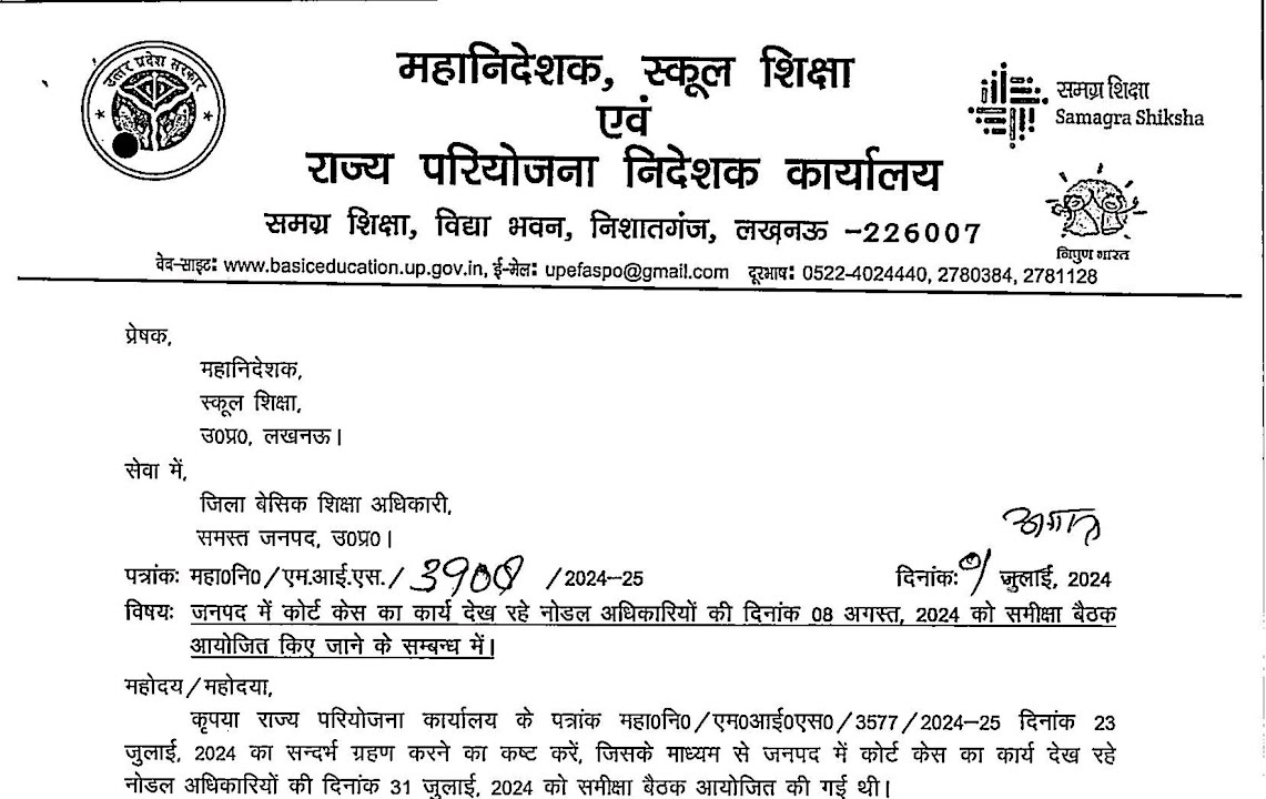 जनपद में कोर्ट केस का कार्य देख रहे नोडल अधिाकारियों की दिनांक 08 अगस्त, 2024 को समीक्षा बैठक आयोजित किए जाने के सम्बन्ध में।