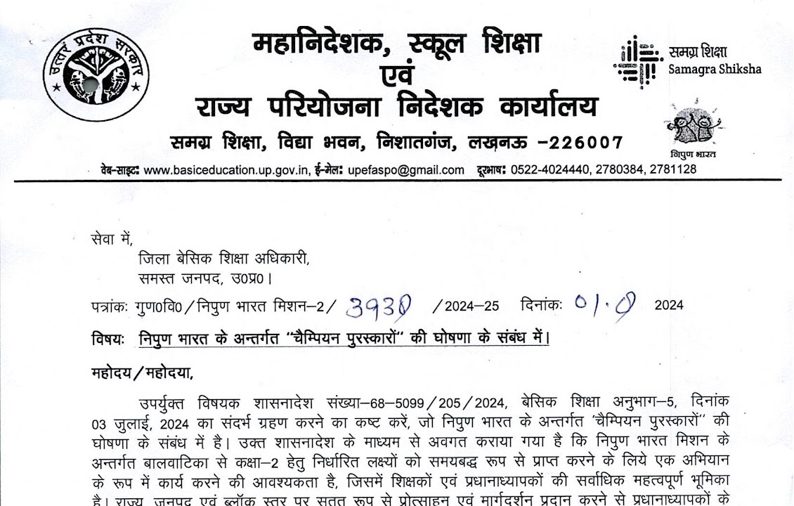 निपुण भारत के अन्तर्गत चैम्पियन पुरस्कारों की घोषणा के सम्बन्ध में। Basic Shiksha Khabar | PRIMARY KA MASTER | SHIKSHAMITRA ...
