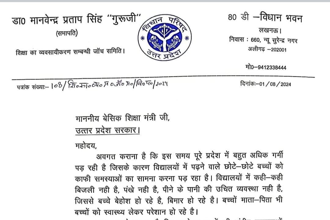 स्कूलों के समय परिवर्तन के संबंध में शासन को लिखा पत्र