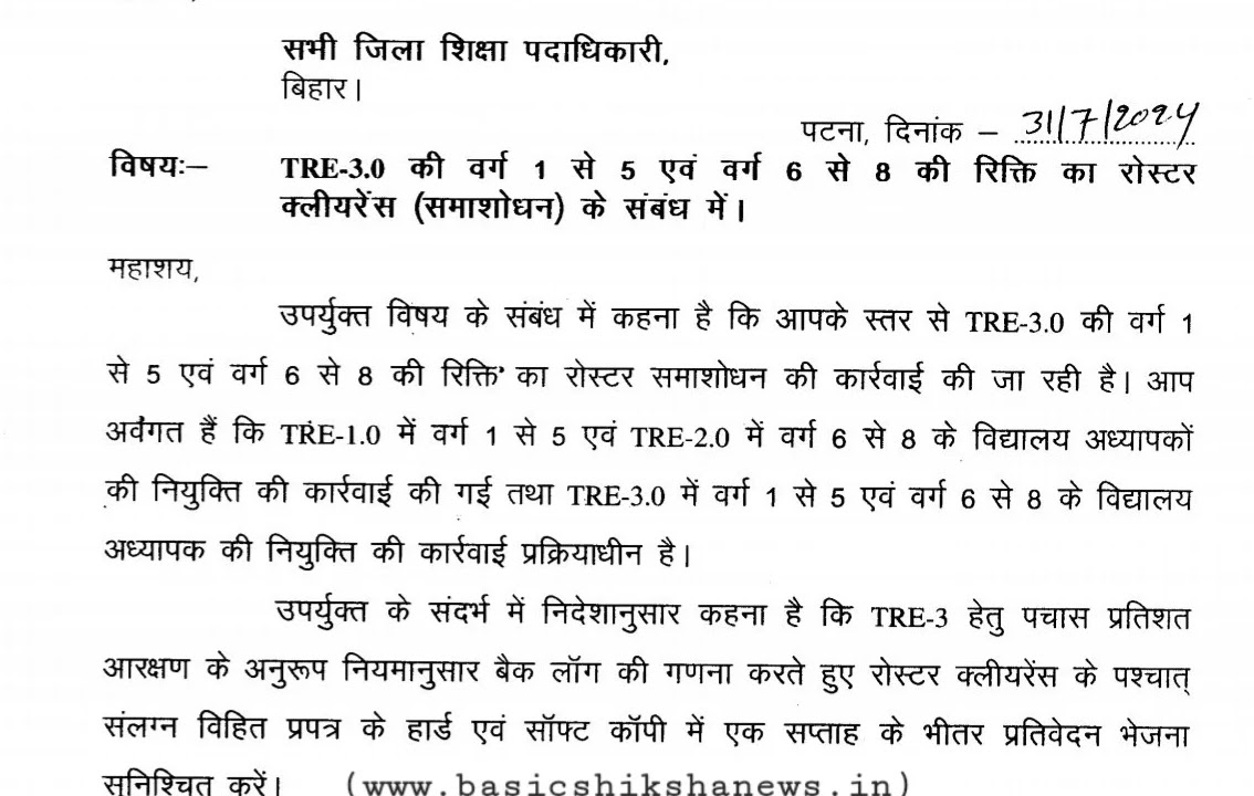 BPSC TRE 3 के रिज़ल्ट में देरी ना हो इसीलिए 50% आरक्षण के अनुरूप ही रोस्टर क्लीयरेंस की तैयारी चल रही है।
