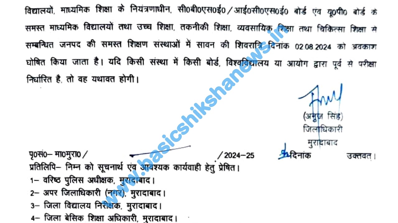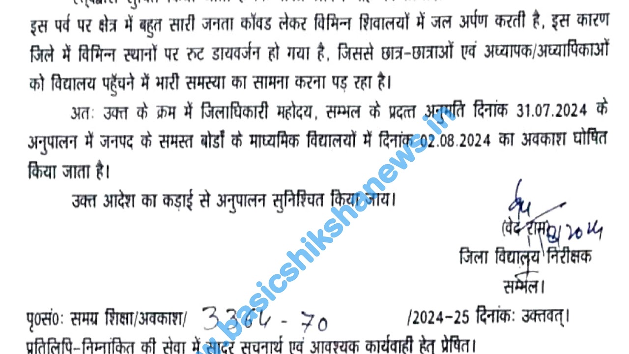 जनपद में सावन माह की शिवरात्रि के कारण दिनांक 02.08.2024 का अवकाश घोषित