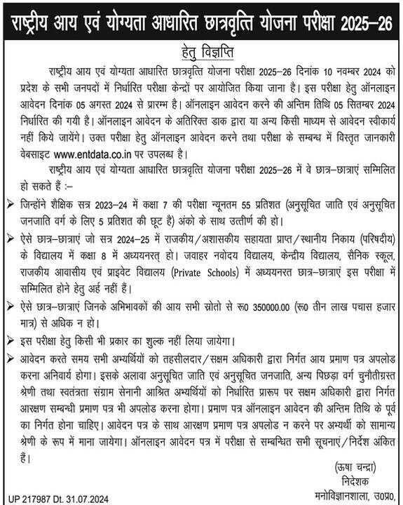 N.M.M.S.E. के लिए आवेदन 05 अगस्त से 05 सितम्बर, 2024 तक। परीक्षा: 10 नवम्बर, 2024 को।