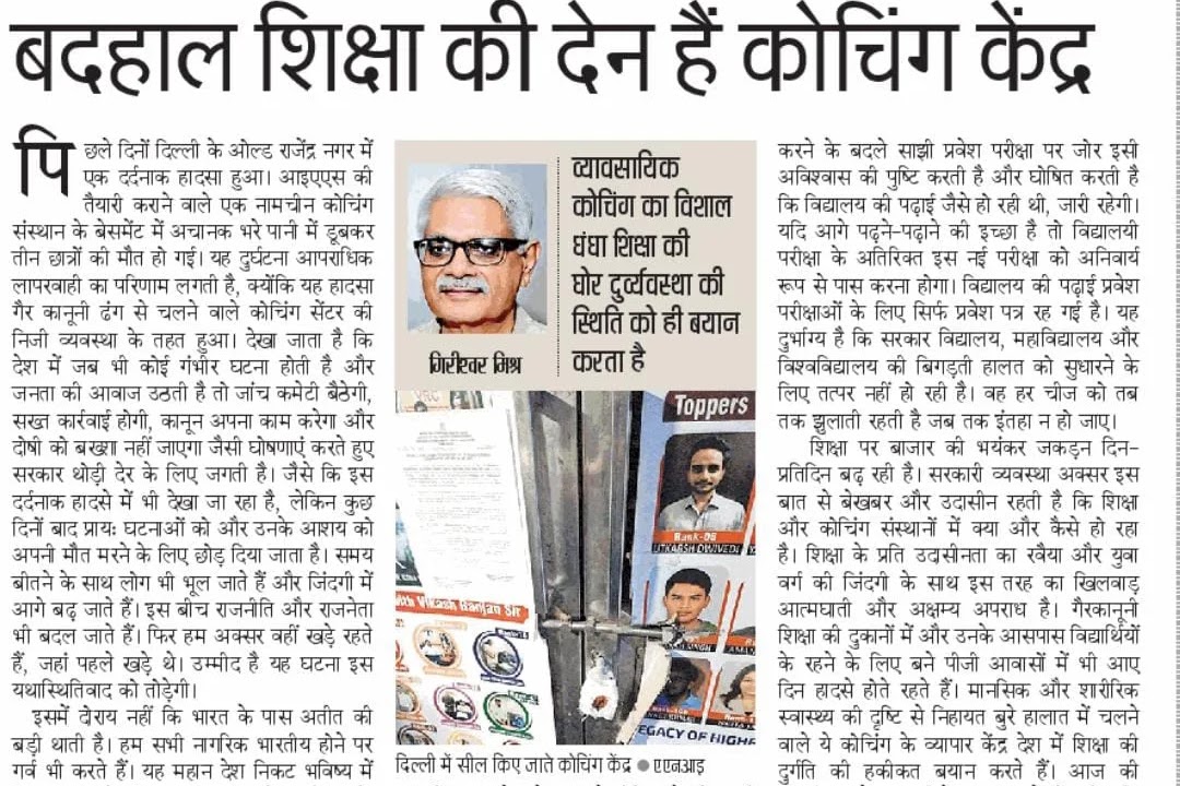 बदहाल शिक्षा की देन हैं कोचिंग केंद्र पिछले दिनों दिल्ली के ओल्ड राजेंद्र नगर में एक दर्दनाक हादसा हुआ। आइएएस ...