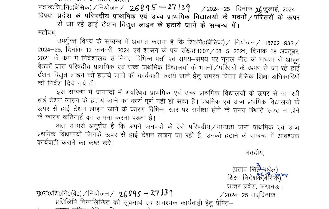 प्रदेश के परिषदीय प्राथमिक एवं उच्च प्राथमिक विद्यालयों के भवनों के ऊपर से जा रहे हाईटेंशन विद्युत लाइन घटाने के सम्बंध में