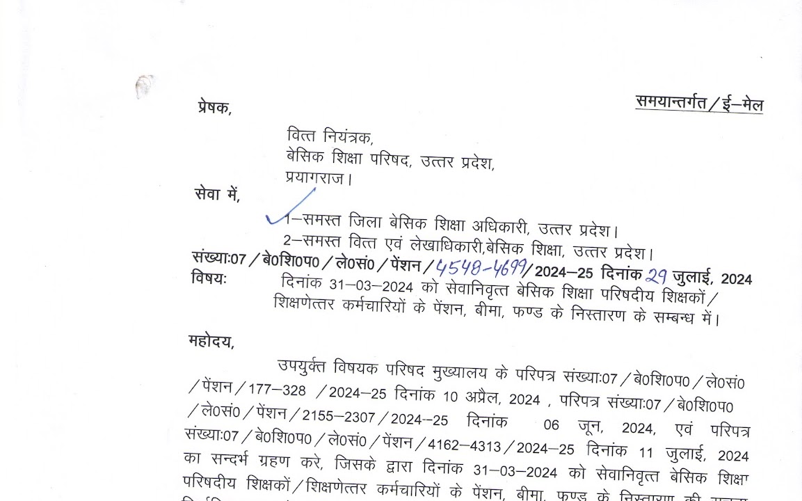 दिनांक 31-03-24 को सेवानिवृत्त शिक्षकों/कर्मचारियों के पेंशन, बीमा, फण्ड के निस्तारण की सूचना उपलब्ध कराने के सम्बन्ध में