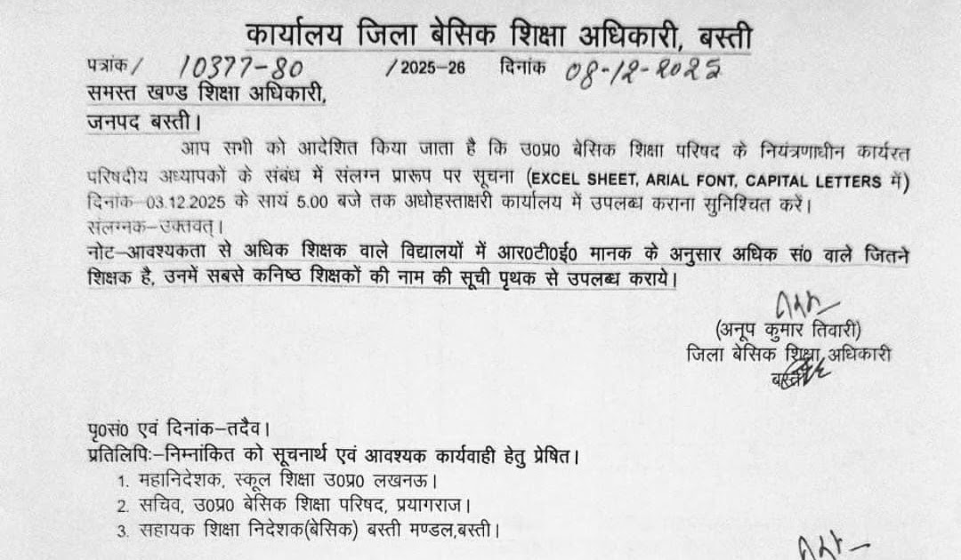 *कनिष्ठ शिक्षक समायोजन : BSA जनपद -बस्ती 👆* 👉8 दिसम्बर को आदेश दिया है कि 3 दिसम्बर तक जमा ...