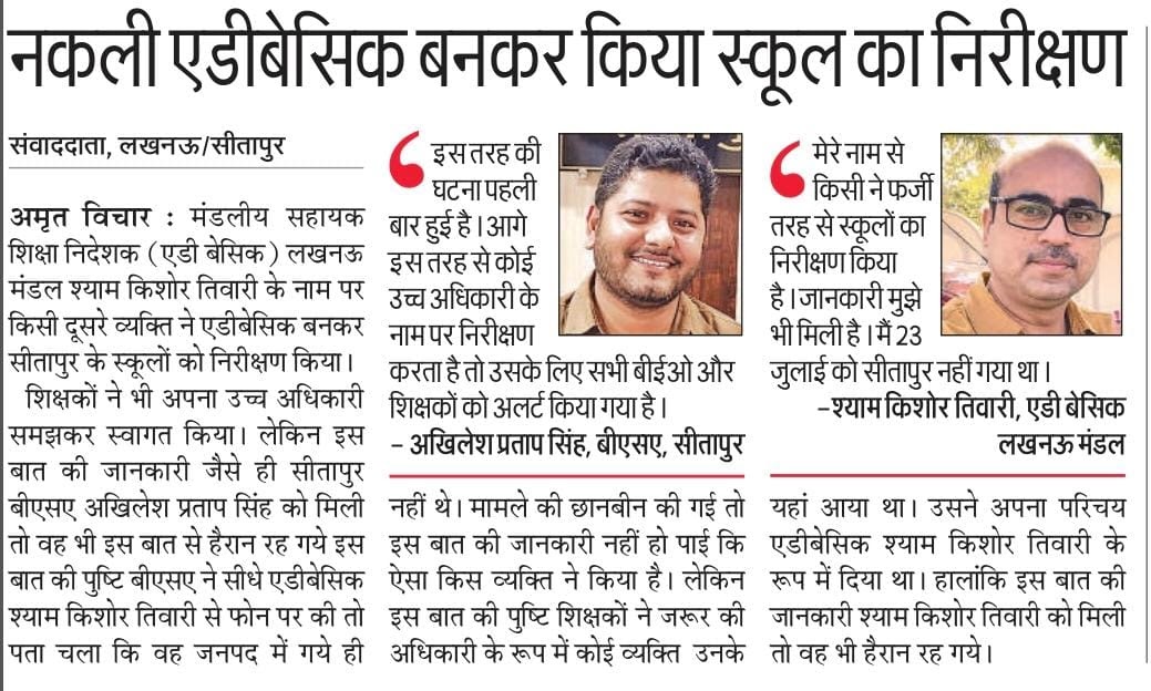नकली एडी बेसिक बनकर स्कूल में किया निरीक्षण अमृत विचार : मंडलीय सहायक शिक्षा निदेशक (एडी बेसिक) लखनऊ मंडल श्याम ...