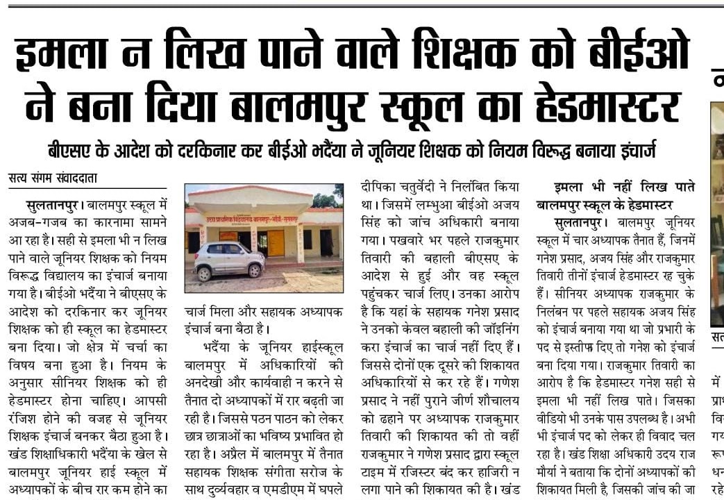 बीएसए के आदेश को दरकिनार कर बीईओ भर्दैया ने जूनियर शिक्षक को नियम विरूद्ध बनाया इंचार्ज सुलतानपुर। बालमपुर स्कूल में ...