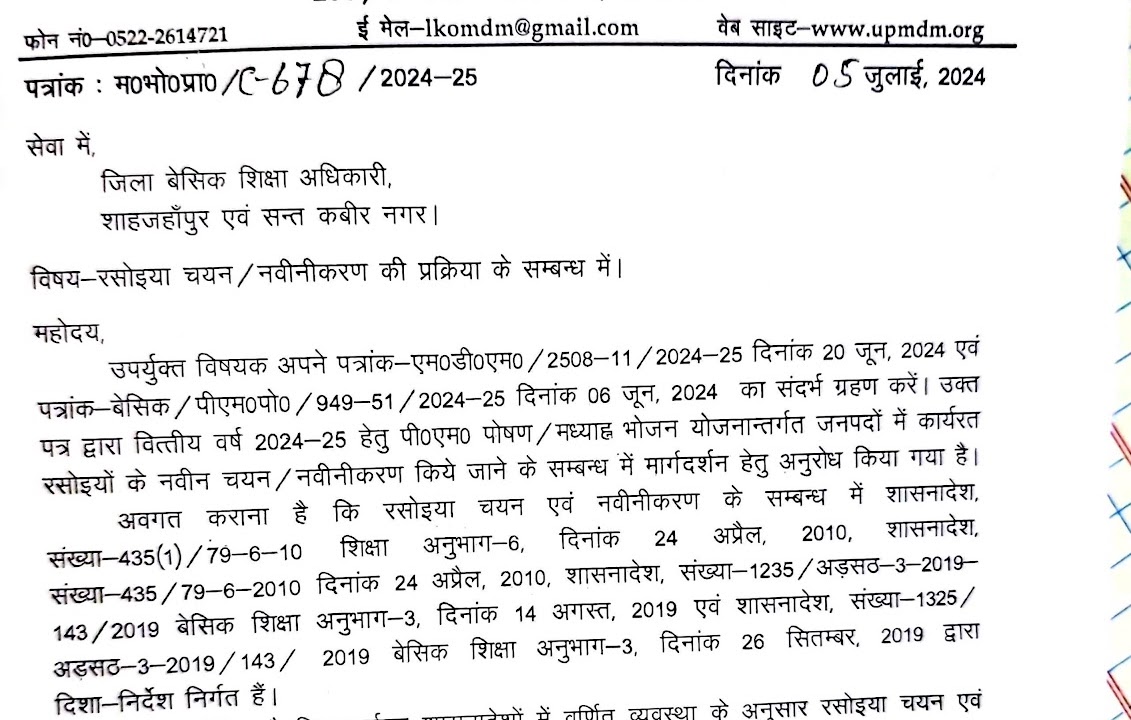 उपर्युक्त विषयक के सम्बन्ध में निदेशक, मध्यान्ह भोजन प्राधिकरण, उ०प्र० लखनऊ के पत्र संख्या-म०भो० प्रा० / सी0-678/2024-25 दिनाँक 05.07.2024 का ...