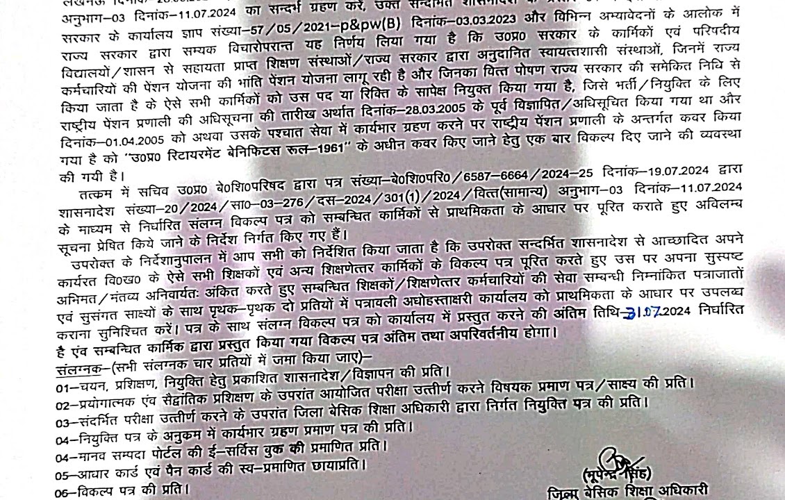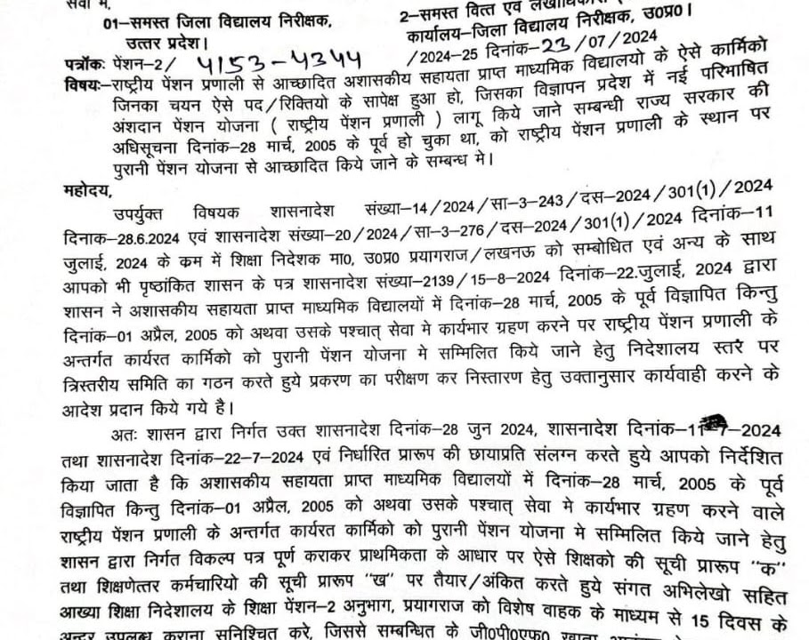 राष्ट्रीय पेंशन प्रणाली से आच्छादित अशासकीय सहायता प्राप्त माध्यमिक विद्यालयो के ऐसे कार्मिको जिनका चयन ऐसे पद/रिक्तियो के सापेक्ष हुआ हो, जिसका विज्ञापन प्रदेश में नई परिभाषित अंशदान पेंशन योजना (राष्ट्रीय पेंशन प्रणाली) लागू किये जाने सम्बन्धी राज्य सरकार की अधिसूचना दिनांक-28 मार्च, 2005 के पूर्व हो चुका था, को राष्ट्रीय पेंशन प्रणाली के स्थान पर पुरानी पेंशन योजना से आच्छादित किये जाने के सम्बन्ध मे समस्त जिला विद्यालय निरीक्षक को आदेश जारी
