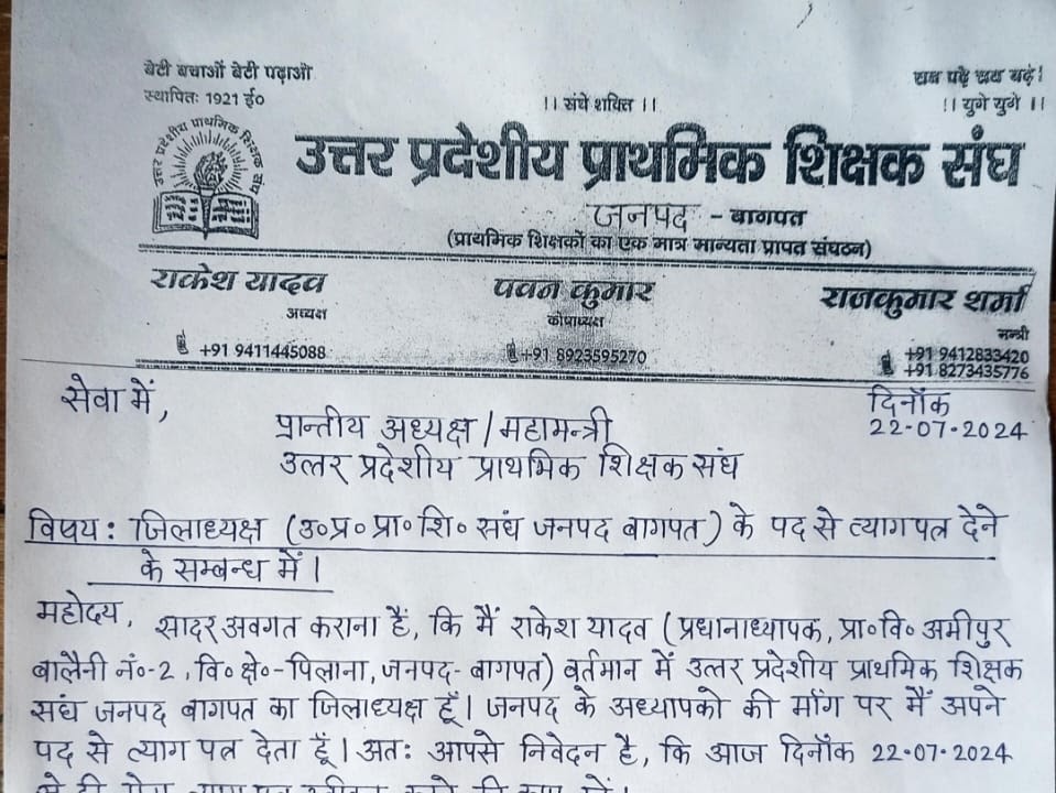 उत्तर प्रदेश की प्राथमिक शिक्षक संघ के जिलाध्यक्ष शिक्षक-शिक्षिकाओ की मांग पर दिया त्यागपत्र