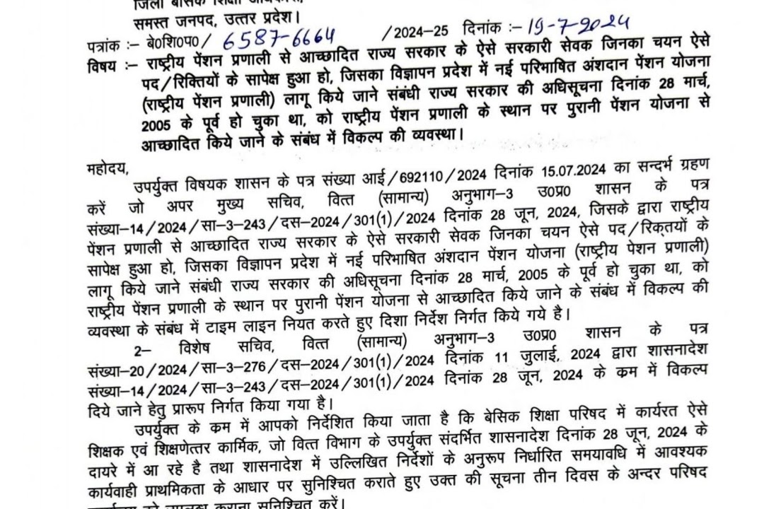 बेसिक शिक्षा परिषद उत्तर प्रदेश प्रयागराज के सचिव महोदय ने तीन दिन के भीतर ही पेंशन का विकल्प पत्र लेने के लिए प्रदेश के सभी बीएसए को पत्र जारी किया