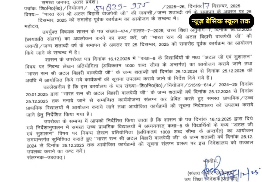*भारत रत्न स्वर्गीय अटल बिहारी वाजपेई* का *जन्म दिवस समारोह* पूर्वक मनाने के संबंध में आदेश जारी।👆 1/2 Basic ...