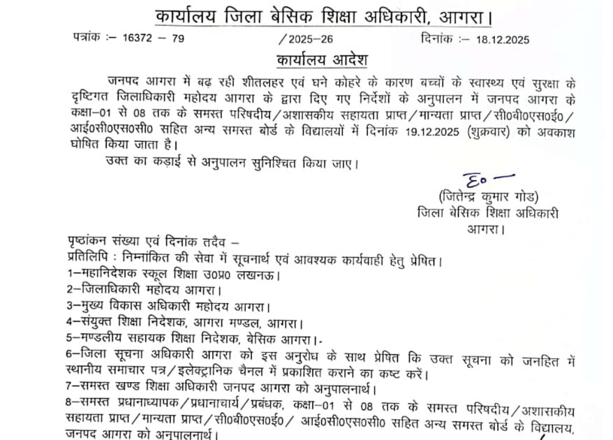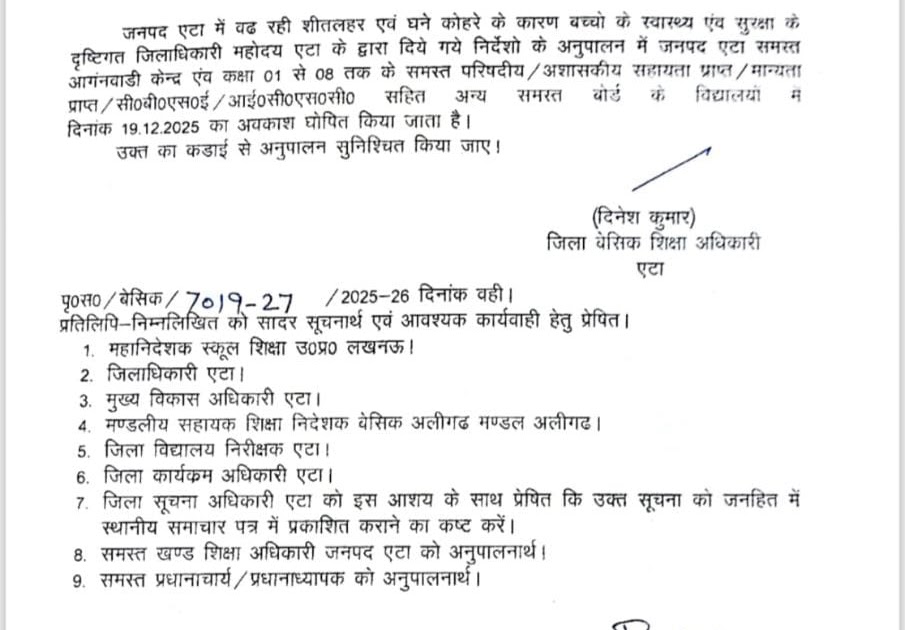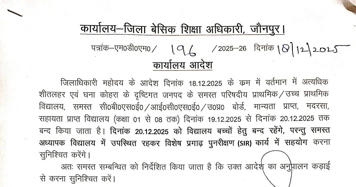 अत्यधिक शीतलहर एवं घने कोहरे के कारण 19 दिसंबर को शिक्षकों एवं बच्चों एवं 20 दिसंबर को विद्यालय बच्चों हेतु बंद – UpdateMarts| PRIMARY KA MASTER | SHIKSHAMITRA | Basic Shiksha News