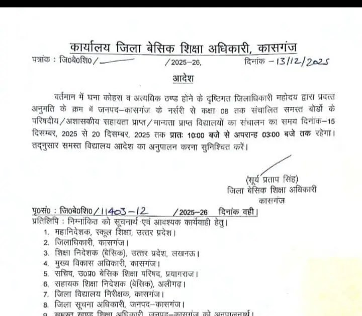 अत्यधिक ठंड एवं घना कोहरा के कारण समस्त परिषदीय/ सहायता प्राप्त/ मान्यता प्राप्त विद्यालयों के संचालन का समय प्रातः ...