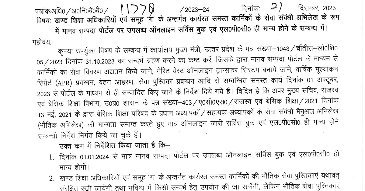 सर्विस बुक समाप्त👍 खण्ड शिक्षा अधिकारियों एवं समूह ‘ग’ के अन्तर्गत कार्यरत समस्त कार्मिकों के सेवा संबंधी अभिलेख के रूप में मानव सम्पदा पोर्टल पर उपलब्ध ऑनलाइन सर्विस बुक एवं एल०पी०सी० ही मान्य होने के सम्बन्ध में। – UpdateMarts| PRIMARY KA MASTER | SHIKSHAMITRA | Basic Shiksha News
