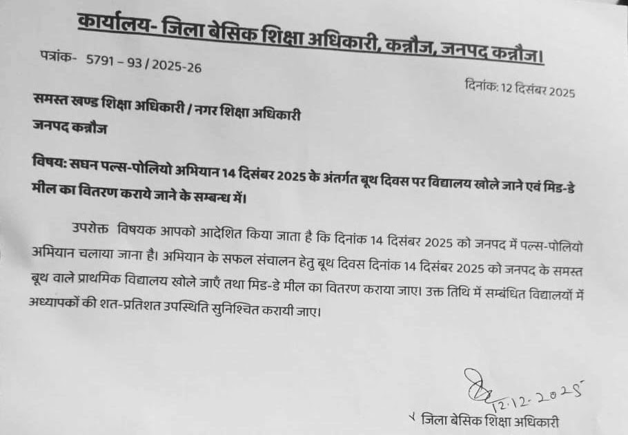 पल्स पोलियो बूथ रविवार (14.12.2025) को विद्यालय खोलने व MDM वितरण किये जाने के लिए आदेश जारी – UpdateMarts| PRIMARY KA MASTER | SHIKSHAMITRA | Basic Shiksha News
