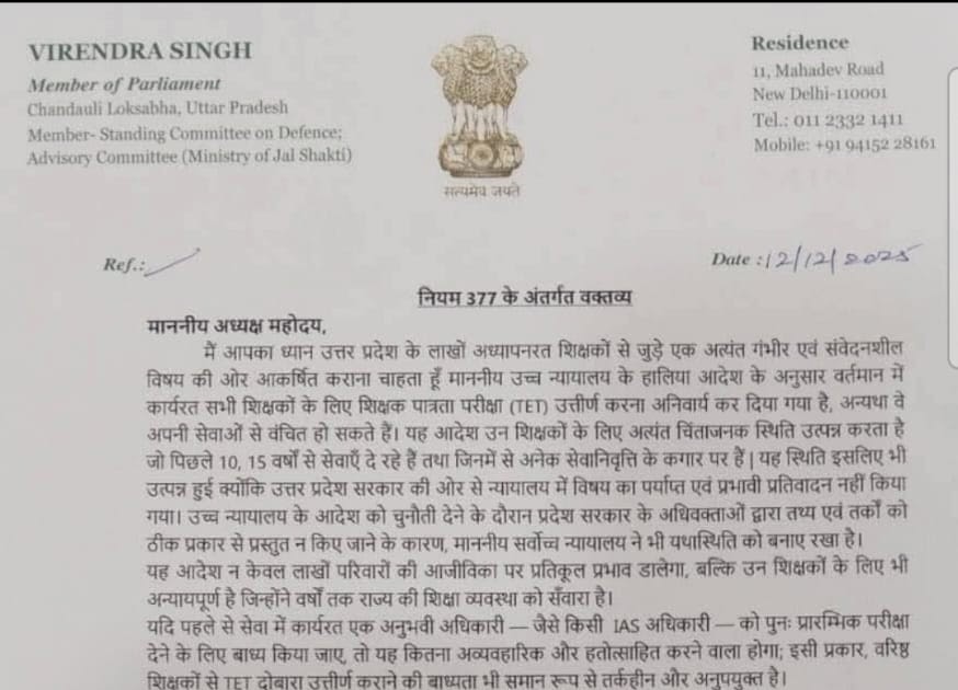 लोकसभा में TET अनिवार्यता मुद्दा उठा — सांसद वीरेंद्र सिंह ने सेवारत शिक्षकों के लिए की न्याय की मांग – UpdateMarts| PRIMARY KA MASTER | SHIKSHAMITRA | Basic Shiksha News