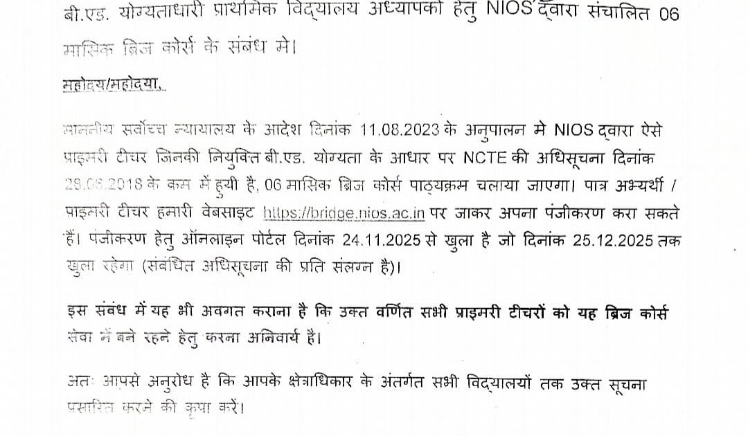 बी.एड. योग्यताधारी प्राथमिक विद्यालय अध्यापको हेतु NIOS द्वारा संचालित 06 मासिक ब्रिज कोर्स के संबंध मे। – UpdateMarts| PRIMARY KA MASTER | SHIKSHAMITRA | Basic Shiksha News