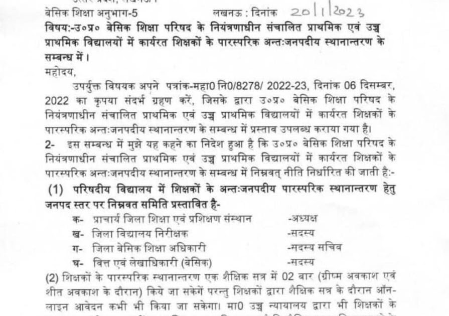 प्रमुख सचिव उत्तर प्रदेश शासन के दिनांक 20 जनवरी 2023 के शासनादेश के अनुसार- “शिक्षकों के पारस्परिक स्थानान्तरण एक ...