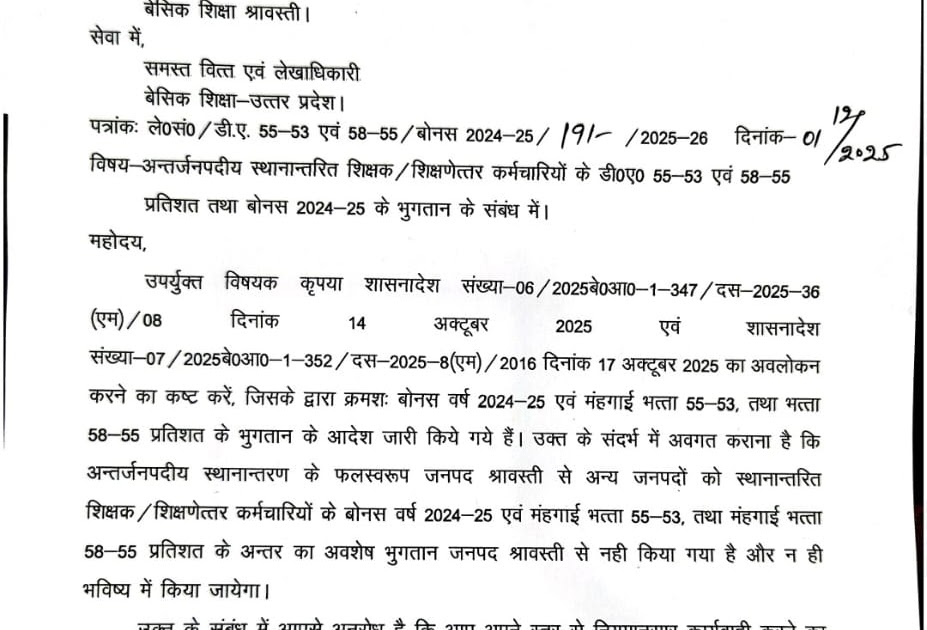 अन्तर्जनपदीय स्थानान्तरित शिक्षक / शिक्षणेत्तर कर्मचारियों के डी0ए0 55-53 एवं 58-55 प्रतिशत तथा बोनस 2024-25 के भुगतान के संबंध में। – UpdateMarts| PRIMARY KA MASTER | SHIKSHAMITRA | Basic Shiksha News