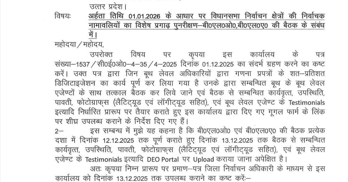 अर्हता तिथि 01.01.2026 के आधार पर विधानसभा निर्वाचन क्षेत्रों की निर्वाचक नामावलियों का *विशेष प्रगाढ़ पुनरीक्षण-बी०एल०ओ०,बी०एल०ए० की बैठक* के संबंध में।👆 – UpdateMarts| PRIMARY KA MASTER | SHIKSHAMITRA | Basic Shiksha News