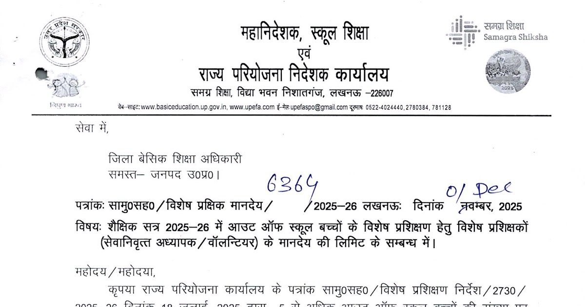 शैक्षिक सत्र 2025-26 में आउट ऑफ स्कूल बच्चों के विशेष प्रशिक्षण हेतु विशेष प्रशिक्षकों (सेवानिवृत्त अध्यापक/वॉलन्टियर) के मानदेय की लिमिट के सम्बन्ध में। – UpdateMarts| PRIMARY KA MASTER | SHIKSHAMITRA | Basic Shiksha News