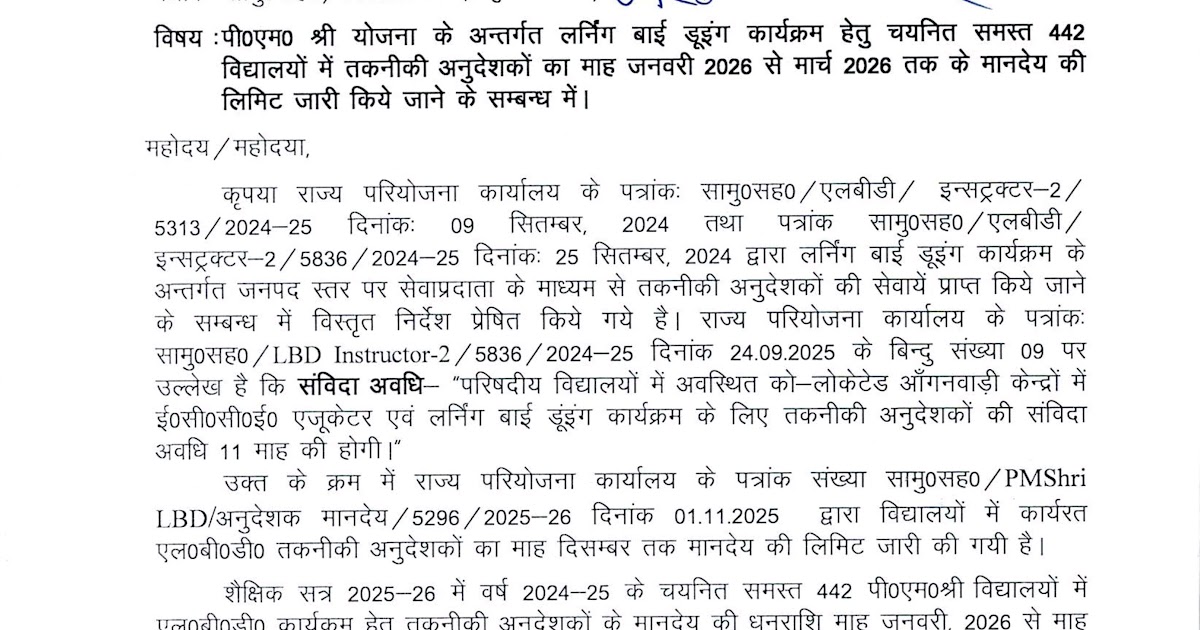 पी0एम0 श्री योजना के अन्तर्गत लर्निग बाई डूइंग कार्यक्रम हेतु चयनित समस्त 442 विद्यालयों में तकनीकी अनुदेशकों का माह जनवरी 2026 से मार्च 2026 तक के मानदेय की लिमिट जारी किये जाने के सम्बन्ध में। – UpdateMarts| PRIMARY KA MASTER | SHIKSHAMITRA | Basic Shiksha News