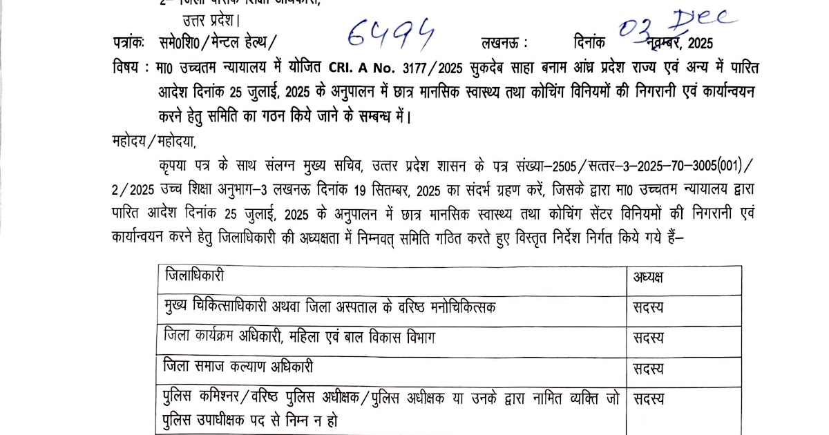 मा० उच्चतम न्यायालय में योजित CRI. A No. 3177/2025 सुकदेब साहा बनाम आंध्र प्रदेश राज्य एवं अन्य में पारित आदेश दिनांक 25 जुलाई, 2025 के अनुपालन में छात्र मानसिक स्वास्थ्य तथा कोचिंग विनियमों की निगरानी एवं कार्यान्वयन करने हेतु समिति का गठन किये जाने के सम्बन्ध में। – UpdateMarts| PRIMARY KA MASTER | SHIKSHAMITRA | Basic Shiksha News