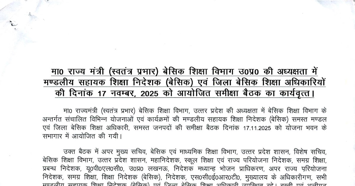 मा0 राज्य मंत्री (स्वतंत्र प्रभार) बेसिक शिक्षा विभाग उ0प्र0 की अध्यक्षता में मण्डलीय सहायक शिक्षा निदेशक (बेसिक) एवं जिला बेसिक शिक्षा अधिकारियों की दिनांक 17 नवम्बर, 2025 को आयोजित समीक्षा बैठक का कार्यवृत्त। – UpdateMarts| PRIMARY KA MASTER | SHIKSHAMITRA | Basic Shiksha News