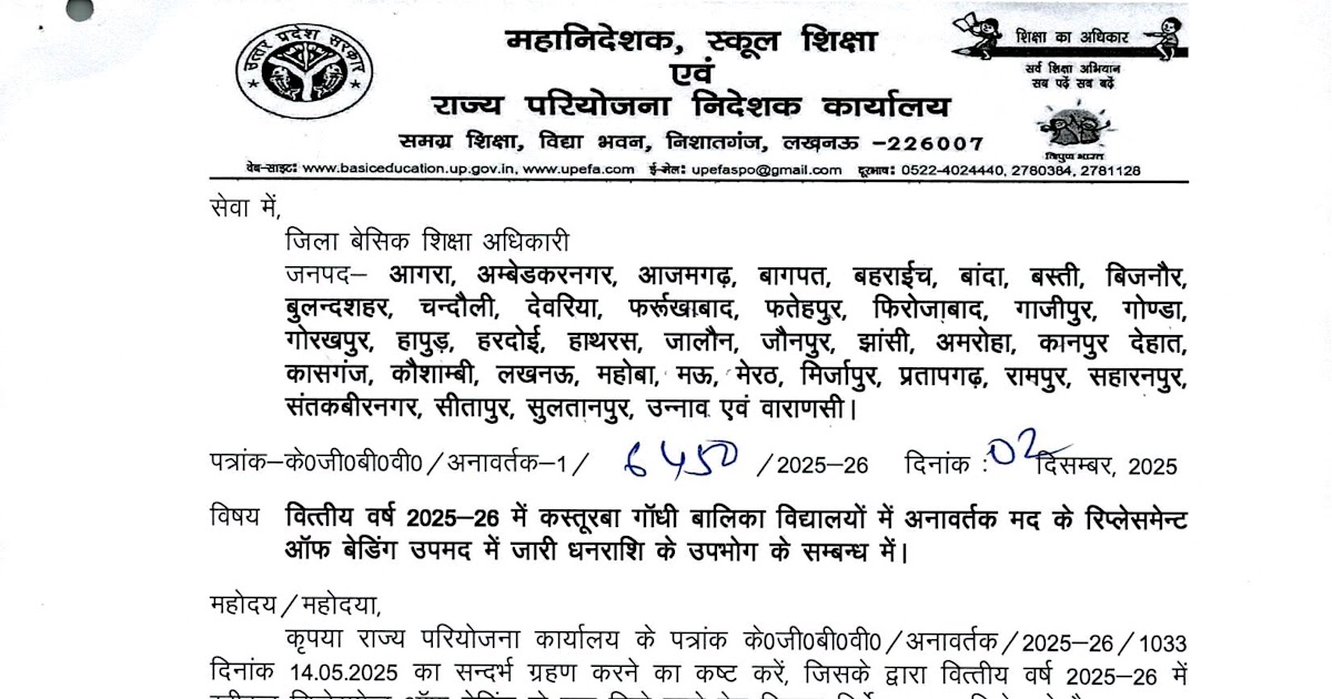 वित्तीय वर्ष 2025-26 में कस्तूरबा गॉधी बालिका विद्यालयों में अनावर्तक मद के रिप्लेसमेन्ट ऑफ बेडिंग उपमद में जारी धनराशि के उपभोग के सम्बन्ध में। – UpdateMarts| PRIMARY KA MASTER | SHIKSHAMITRA | Basic Shiksha News