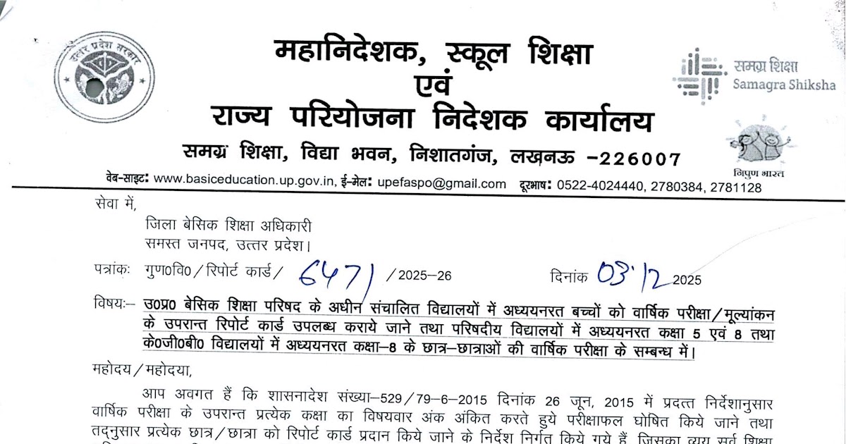 उ0प्र0 बेसिक शिक्षा परिषद के अधीन संचालित विद्यालयों में अध्ययनरत बच्चों को वार्षिक परीक्षा/मूल्यांकन के उपरान्त रिपोर्ट कार्ड उपलब्ध कराये जाने तथा परिषदीय विद्यालयों में अध्ययनरत कक्षा 5 एवं 8 तथा के0जी0बी0 विद्यालयों में अध्ययनरत कक्षा-8 के छात्र-छात्राओं की वार्षिक परीक्षा के सम्बन्ध में। – UpdateMarts| PRIMARY KA MASTER | SHIKSHAMITRA | Basic Shiksha News