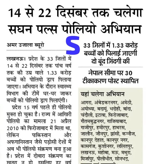 लखनऊ। प्रदेश के 33 जिलों में 14 से 22 दिसंबर तक पांच वर्ष तक की उम्र वाले 1.33 करोड़ बच्चों ...