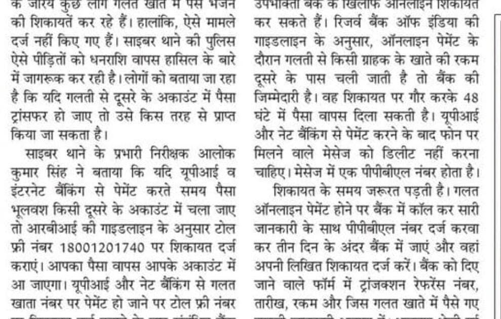 यदि UPI या इंटरनेट बैंकिंग से पैसा किसी गलत खाते में चला गया है तो तुरन्त 18001201740 टोल फ्री ...