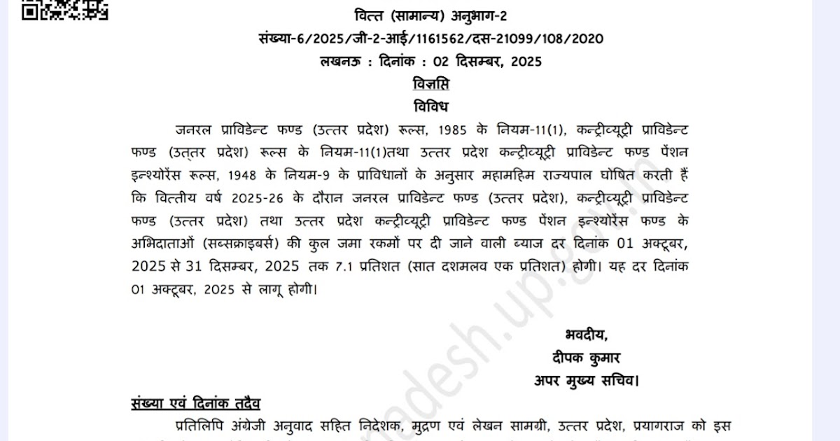 “उत्तर प्रदेश सरकार ने वित्तीय वर्ष 2025-26 के लिए जनरल प्रोविडेंट फण्ड (GPF) पर ब्याज दर 7.1% की रखी, ...