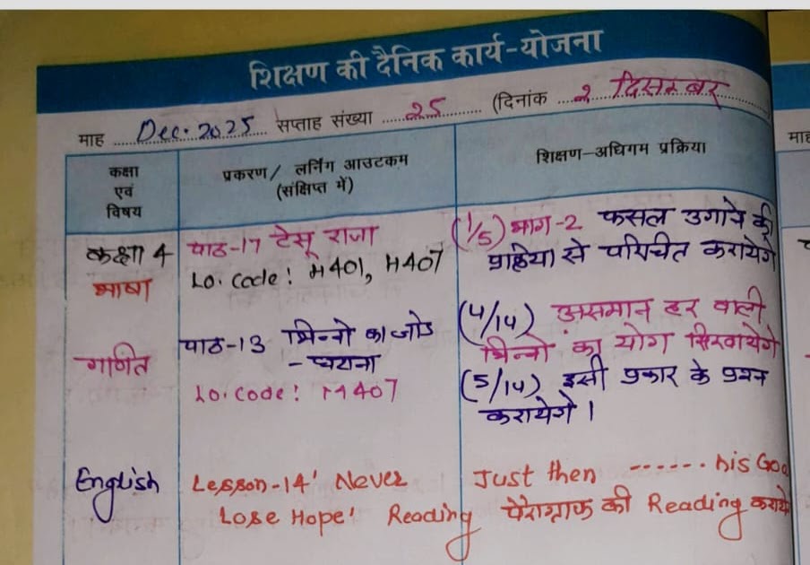 Teacher diary: दिनांक 02 दिसंबर 2025 कक्षा- 01, 02, 03, 04, 05 की भरी हुई शिक्षक डायरी , देखें