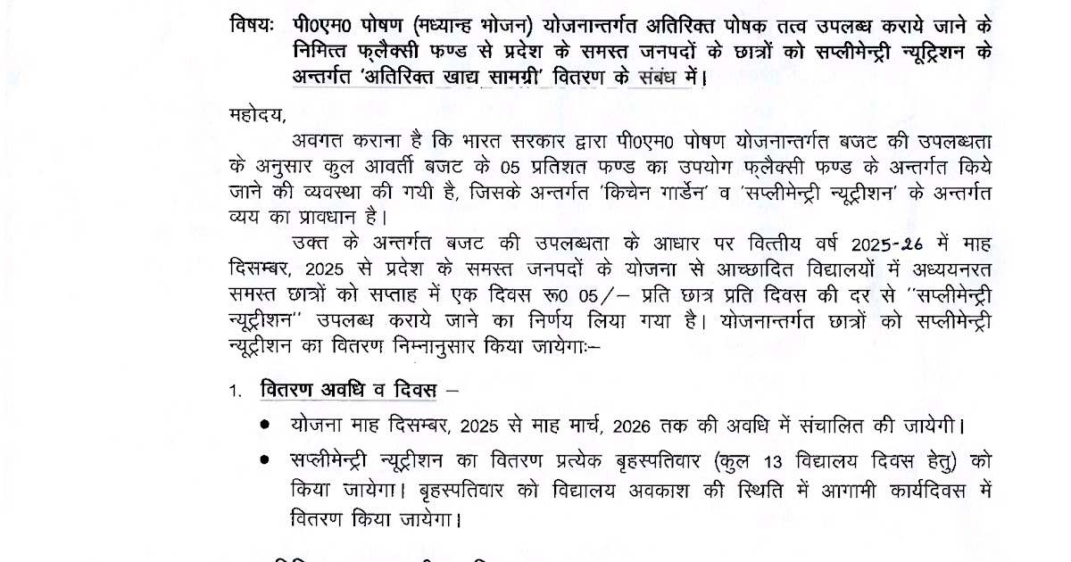 मार्च 2026 तक छात्रों को सप्लीमेन्ट्री न्यूट्रिशन के अन्तर्गत ‘अतिरिक्त खाद्य सामग्री वितरण के संबंध में। Basic Shiksha Khabar ...