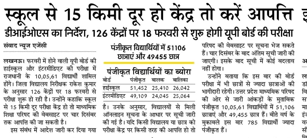 प्रयागराज,। यूपी बोर्ड परीक्षा के केंद्रों में परीक्षार्थियों के आवंटन की संख्या दो हजार से बढ़ाकर 2200 करने के ...