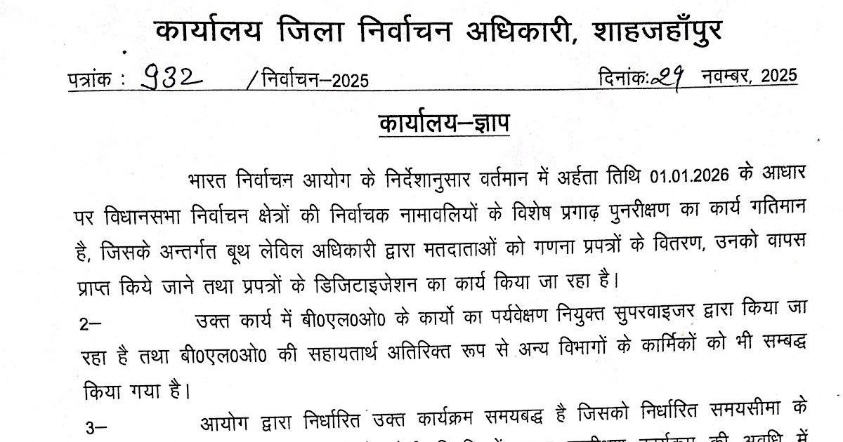 कार्यालय-ज्ञाप भारत निर्वाचन आयोग के निर्देशानुसार वर्तमान में अर्हता तिथि 01.01.2026 के आधार पर विधानसभा निर्वाचन क्षेत्रों की निर्वाचक ...