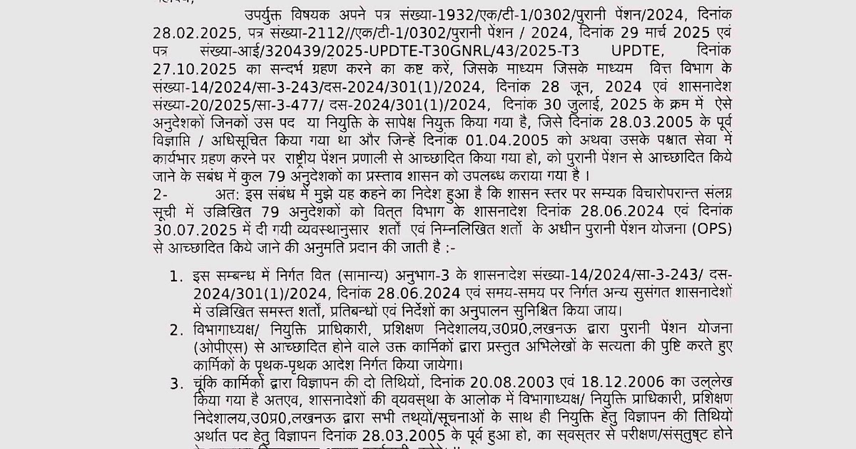 विषयः-अनुदेशकों को राष्ट्रीय पेशन प्रणाली (NPS) के स्थान पर पुरानी पेंशन योजना (OPS) से आच्छादित किये जाने के संबंध ...