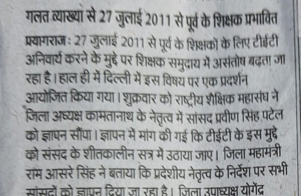 प्रयागराज : 27 जुलाई 2011 से पूर्व के शिक्षकों के लिए टीईटी अनिवार्य करने के मुद्दे पर शिक्षक समुदाय ...
