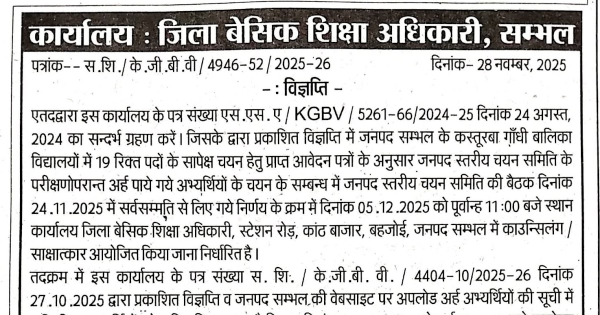कस्तूरबा गांधी आवासीय बालिका विद्यालय सम्भल में टीचिंग और नॉन टीचिंग पदों पर 19 पदों के सापेक्ष चयनित अभ्यर्थियों का 05.12.2025 को काउंसलिंग/साक्षात्कार होगा.. – UpdateMarts| PRIMARY KA MASTER | SHIKSHAMITRA | Basic Shiksha News