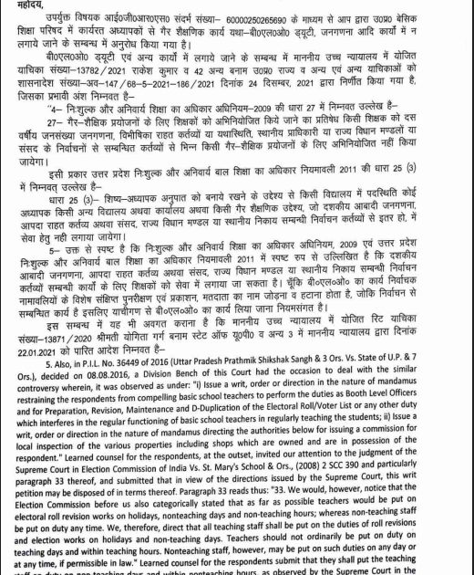 गैर शैक्षणिक कार्यों यथा BLO, जनगणना अधिकारियों में न लगाने संबंधी आईजीआरएस का सचिव बेसिक शिक्षा परिषद महोदय द्वारा ...