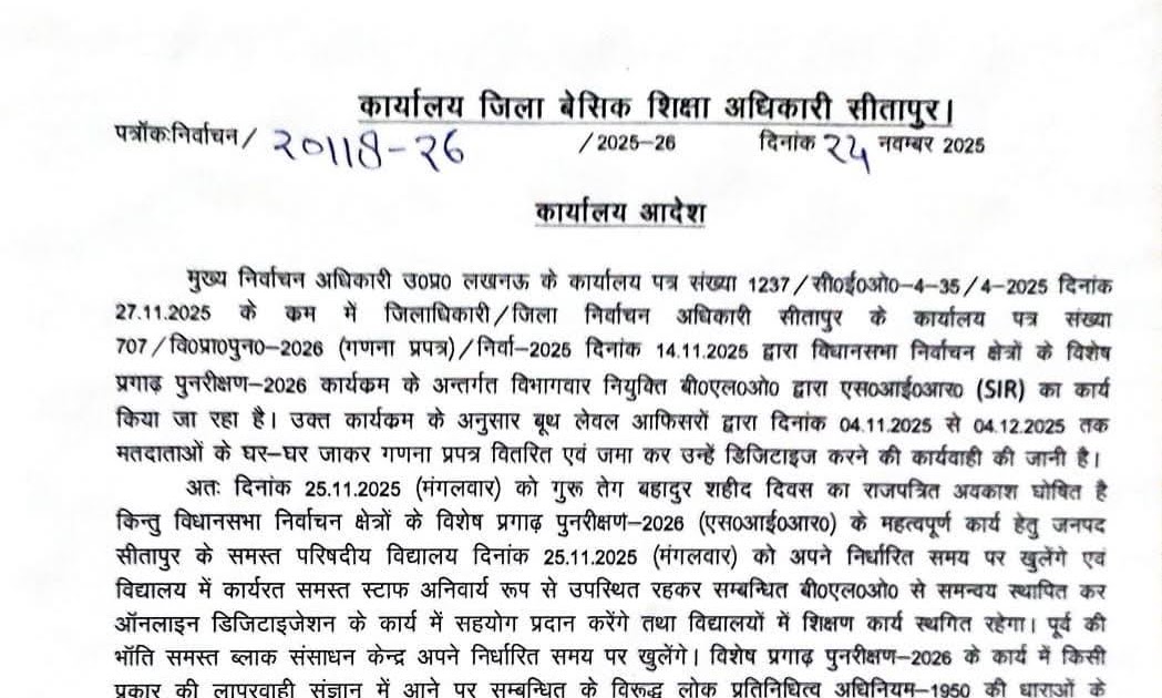 आज 25/11/2025 को खुले रहेंगे विद्यालय, S.I.R का कार्य होगा। 🚨समस्त शिक्षकों की उपस्थिति अनिवार्य। जनपद : सीतापुर Basic Shiksha ...