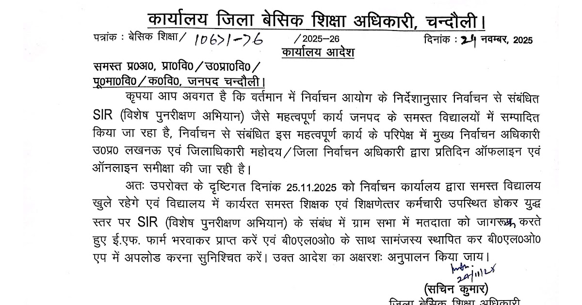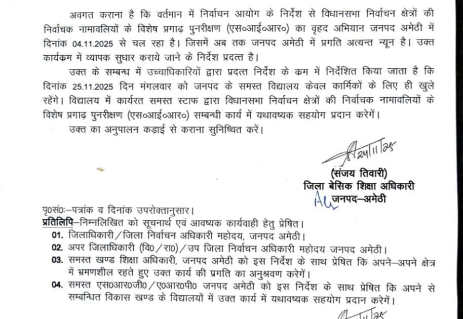 25.11.2025 दिन मंगलवार को जनपद के समस्त विद्यालय केवल कार्मिकों के लिए ही खुले रहेंगे। विद्यालय में कार्यरत समस्त ...
