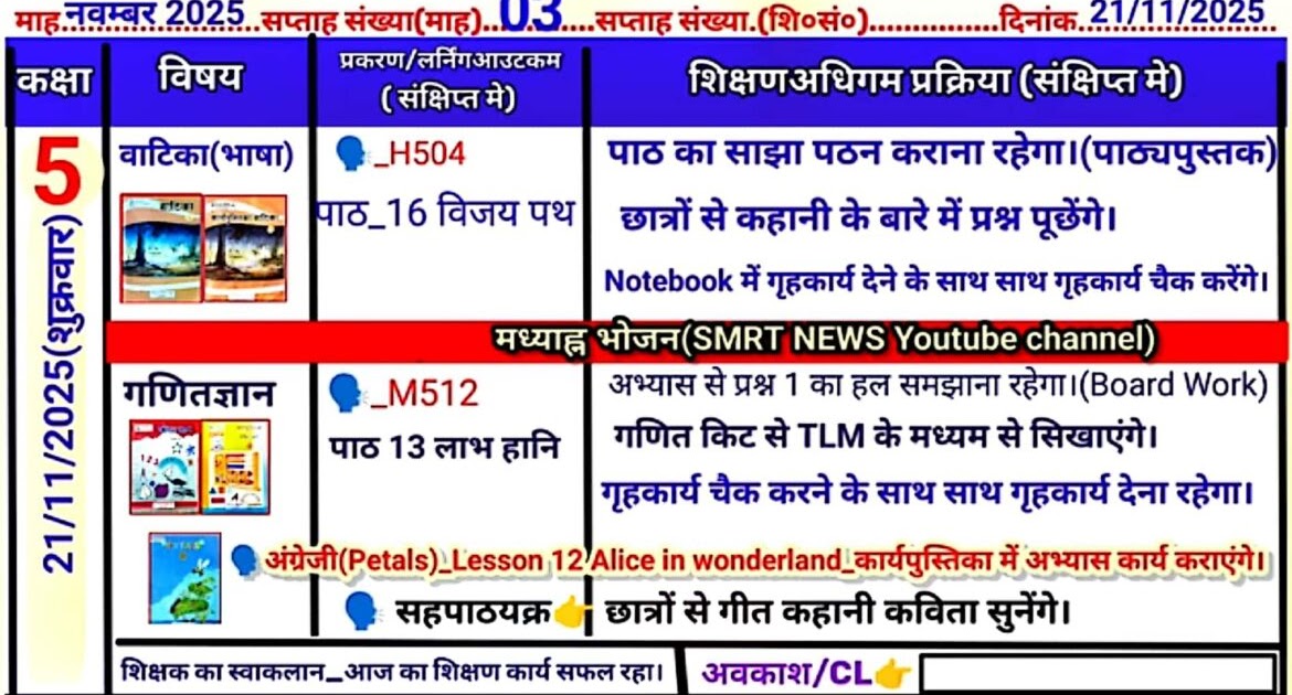 Teacher diary: दिनांक 21 नवंबर 2025 कक्षा- 01, 02, 03, 04, 05 की भरी हुई शिक्षक डायरी , देखें