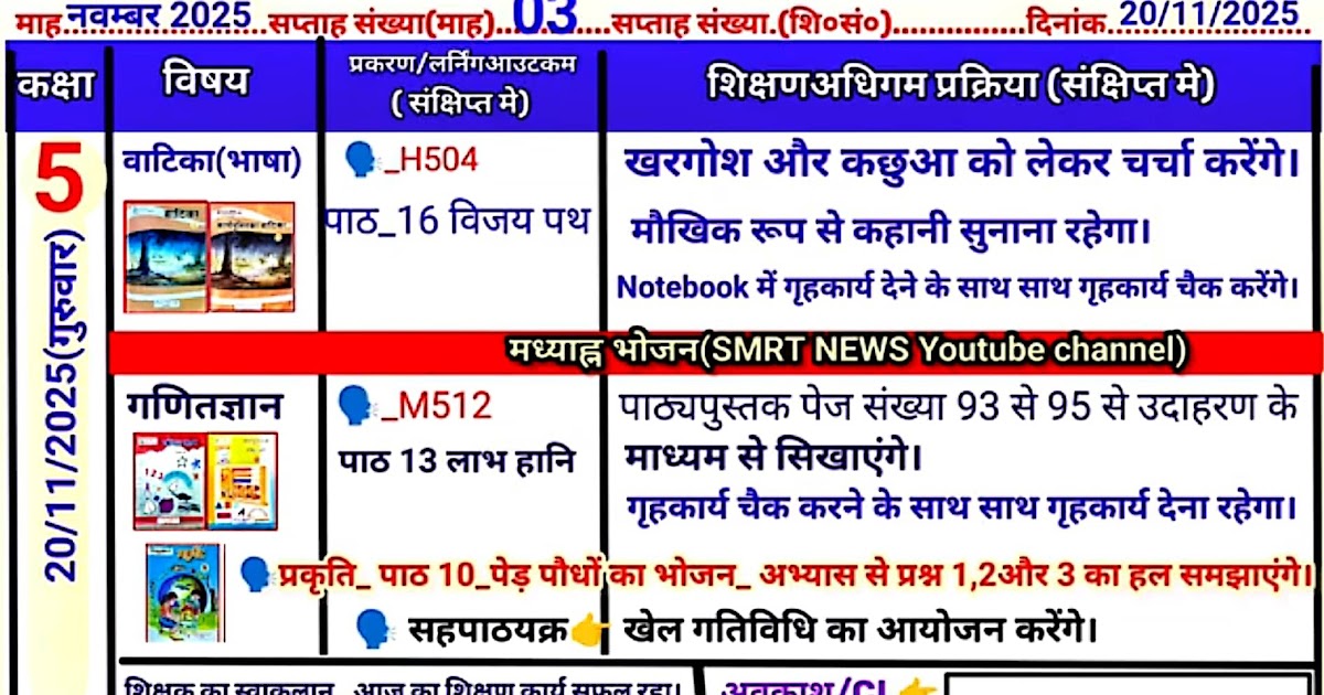Teacher diary: दिनांक 20 नवंबर 2025 कक्षा- 01, 02, 03, 04, 05 की भरी हुई शिक्षक डायरी , देखें ...