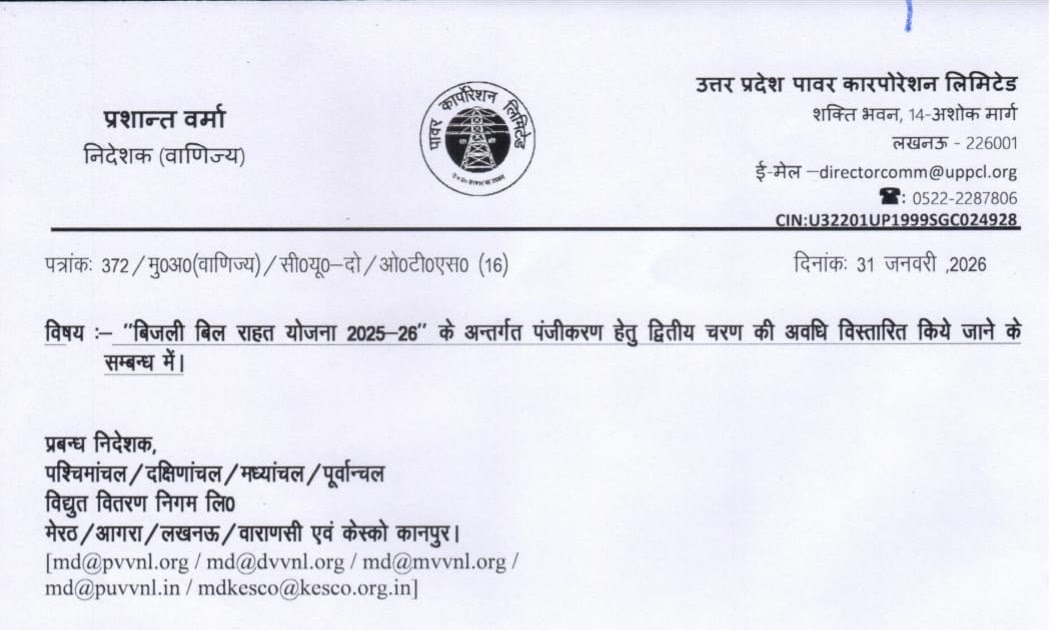 *बिजली बिल राहत योजना 2025-26* के अन्तर्गत पंजीकरण हेतु द्वितीय चरण की अवधि को 5 फरवरी तक विस्तारित किया ...