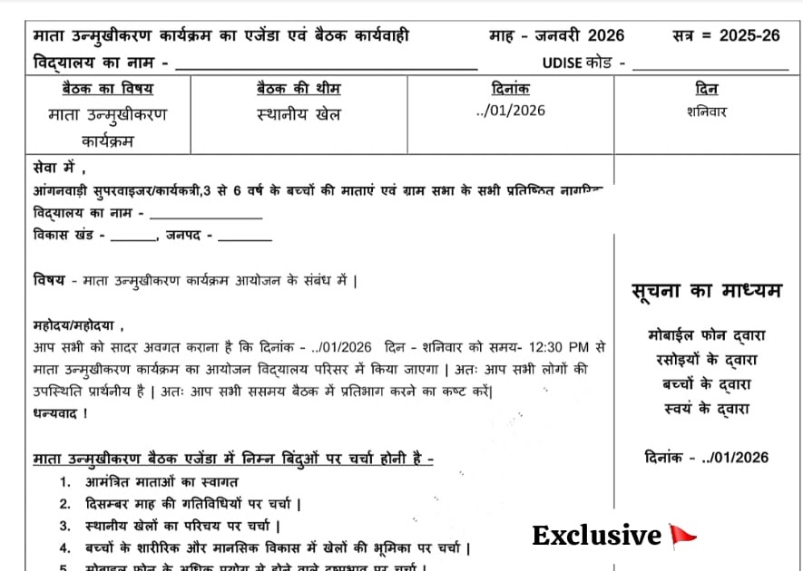 माता उन्मुखीकरण कार्यक्रम का एजेंडा एवं बैठक जनवरी 2026 – UpdateMarts| PRIMARY KA MASTER | SHIKSHAMITRA | Basic Shiksha News