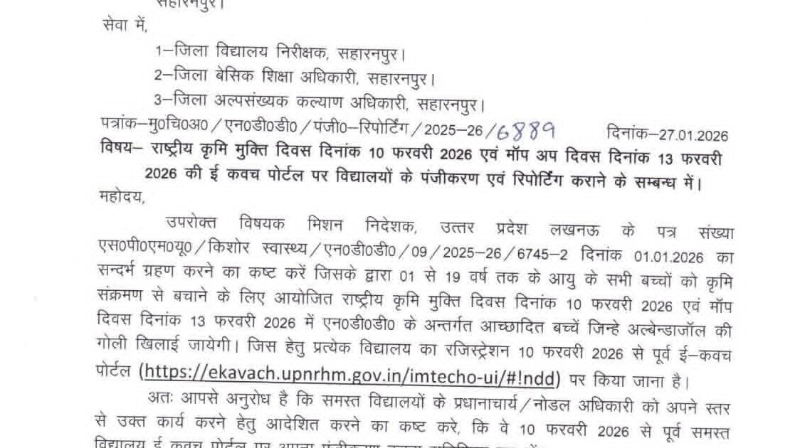राष्ट्रीय कृमि मुक्ति दिवस दिनांक 10 फरवरी 2026 एवं मॉप अप दिवस दिनांक 13 फरवरी 2026 की ई कवच पोर्टल पर विद्यालयों के पंजीकरण एवं रिपोर्टिंग कराने के सम्बन्ध में। – UpdateMarts| PRIMARY KA MASTER | SHIKSHAMITRA | Basic Shiksha News
